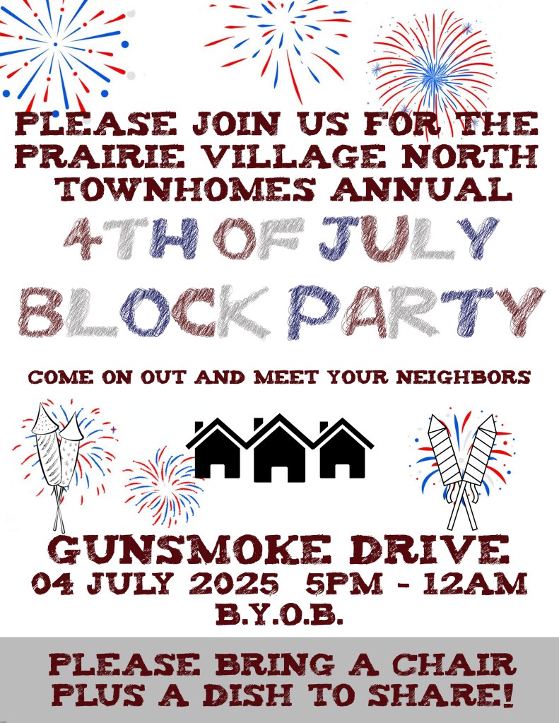 HOA members and their families are invited to sit out in Gunsmoke Drive from 5pm to midnight on July 4th, 2025 and enjoy a neighborhood potluck!